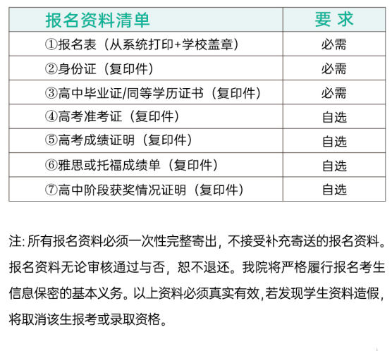考生报名成功后,打印系统生成的《开元集团网站英国高等教育项目招生报名表》,并将下列表中资料的复印件按序号从上到下装订(无需封面),使用中国邮政快递(EMS)送达至湖北省武汉市洪山区珞狮路 205号开元集团网站国际教育学院招生办公室(东院弘毅楼 518 室)027-87585099陈老师收。文件内容备注为“招生报名资料"。