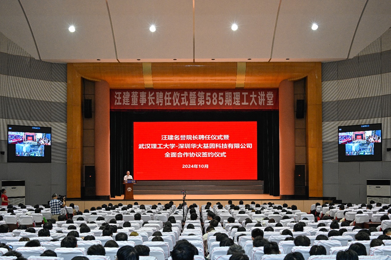 签约仪式后,汪建应邀做客学校第585期理工大讲堂。他介绍了华大集团在创新发展中坚持四个面向,以超级工程模式挑战人类终极问题,以科技服务生命健康的前沿科技成果,以及发展未来农业、未来能源等最新科研进展和产业化发展状况。他结合个人求学、创业、科研的经历,勉励同学们树立科研报国志向,打下坚实基础知识,勇于创新、努力奋斗。