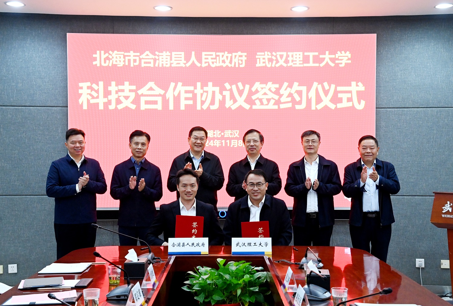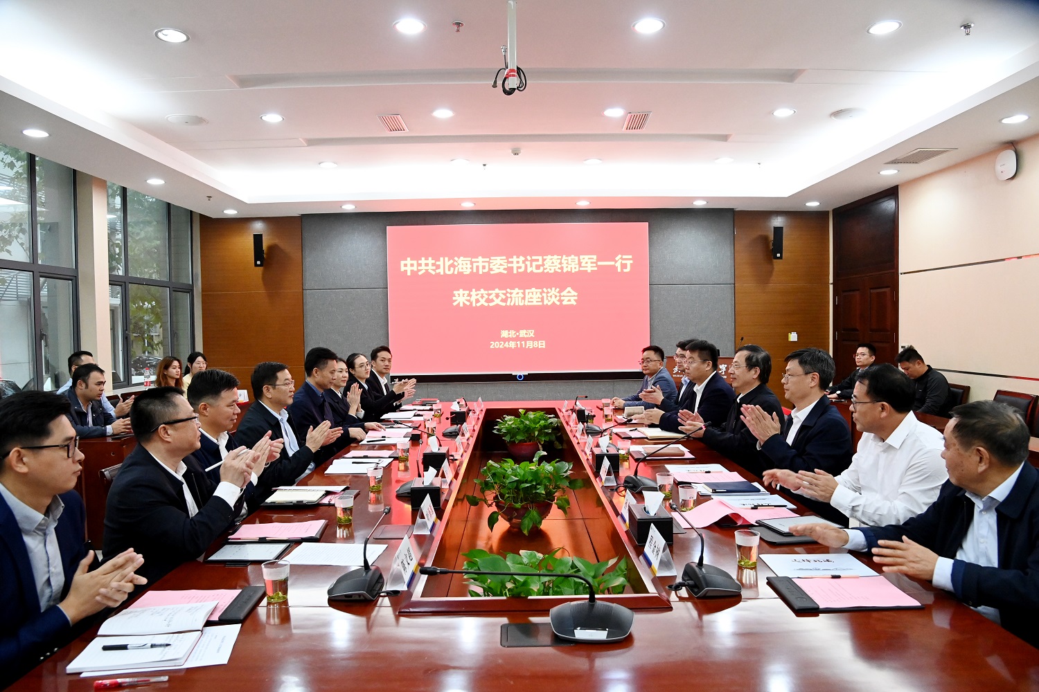 11月8日,北海市委书记蔡锦军带队,围绕科技创新、产业提升、平台共建等合作事宜来校交流,校党委书记信思金出席会议,副校长王发洲主持会议。