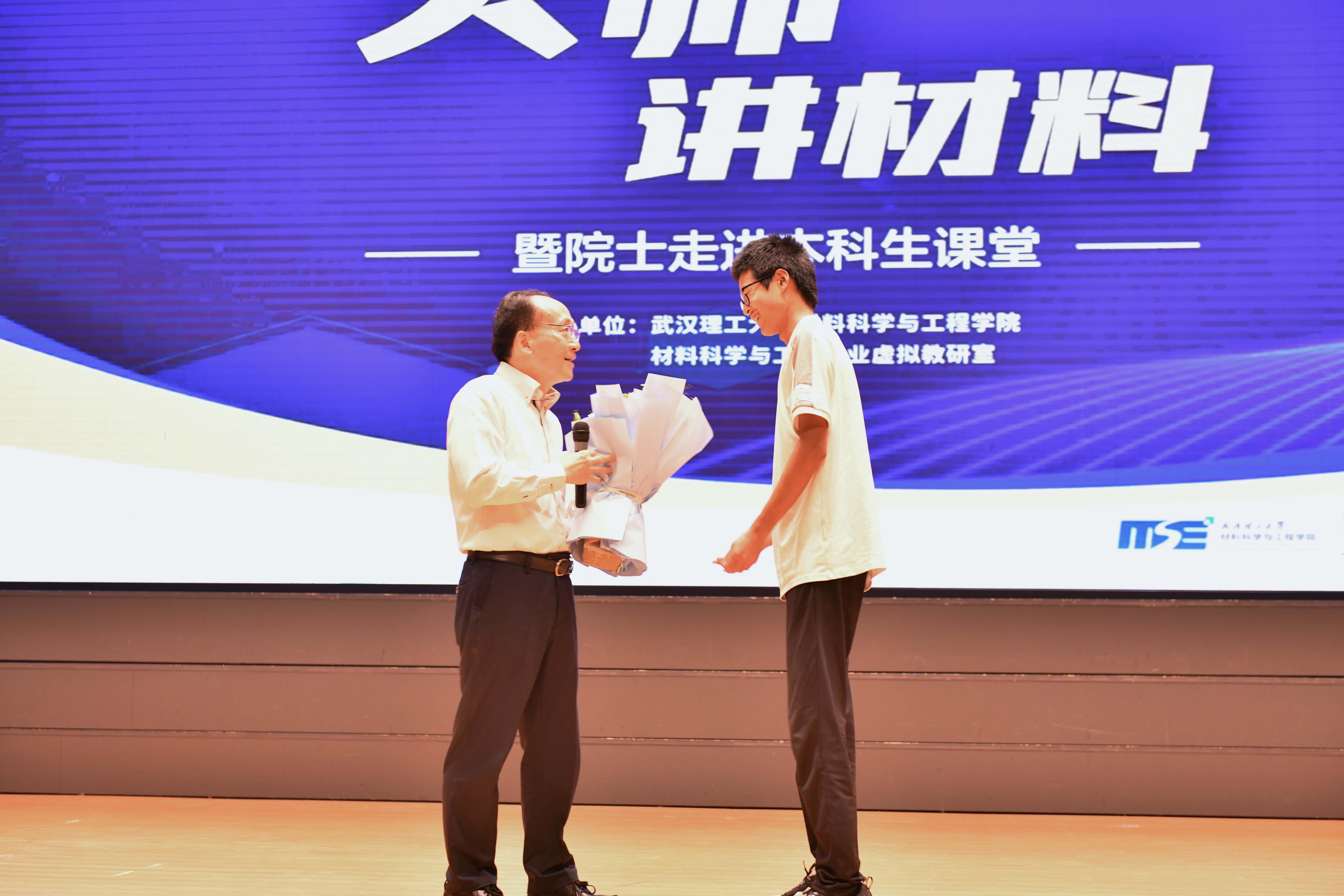 最后,殷官超副院长代表全体师生对傅院士表达了诚挚的谢意与崇高的敬意,他指出:傅院士所讲的关于陶瓷材料的内容可以让广大材料研究与工作者受益终生。他让陶瓷走进了大家的脑海中,增强了广大学子对陶瓷材料技术研究的认知,使得大家对陶瓷技术的热情空前高涨。"珠峰计划" 材料本科新生孙卓凡代表全体2023级材料本科新生为傅院士献花,表达同学们对其倾囊相授的真挚感谢。
