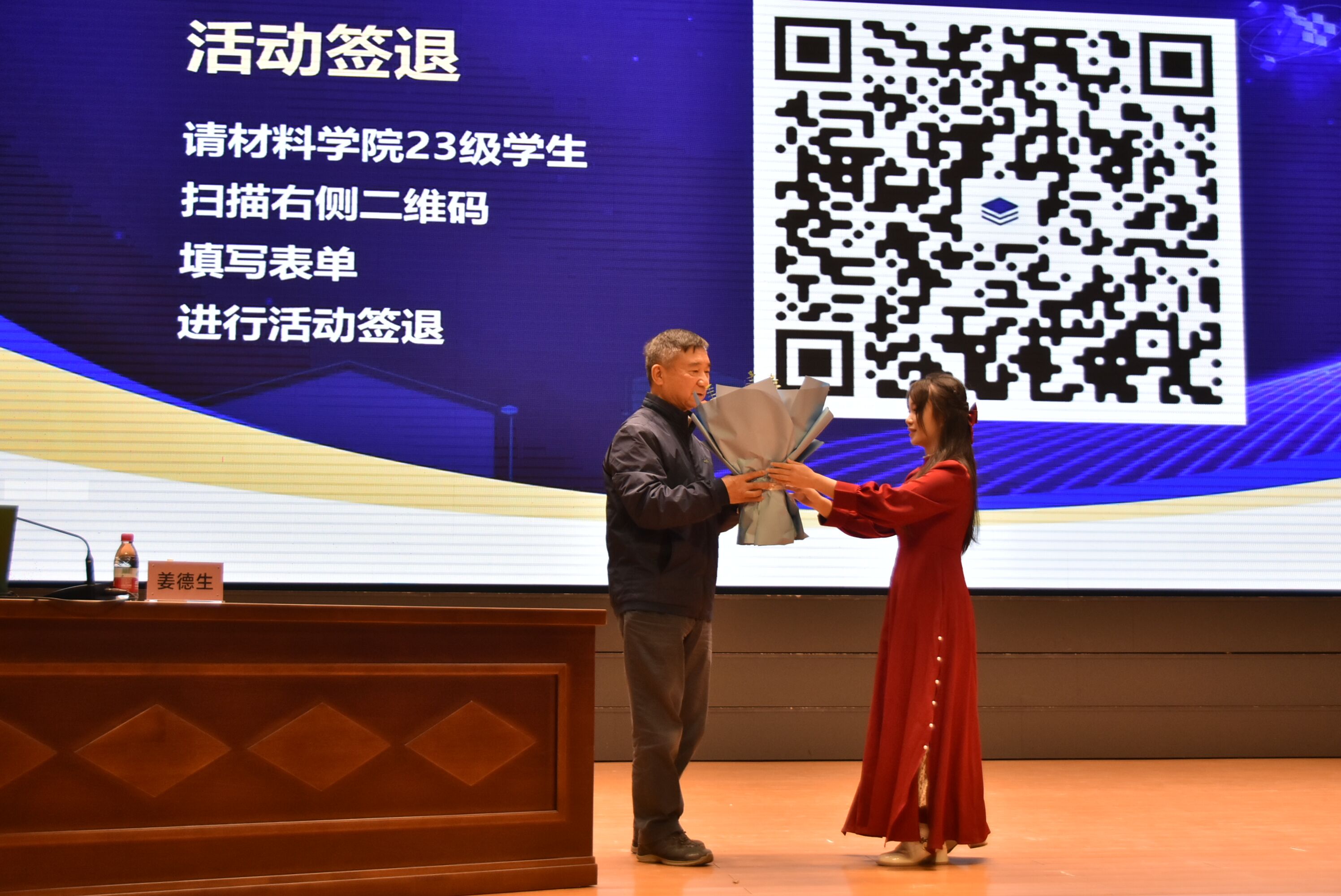 活动最后,殷官超副院长代表全体师生向姜德生院士表达了崇高的敬意。为感谢姜德生院士为本次活动的辛苦付出,学生代表登台为姜院士献花。