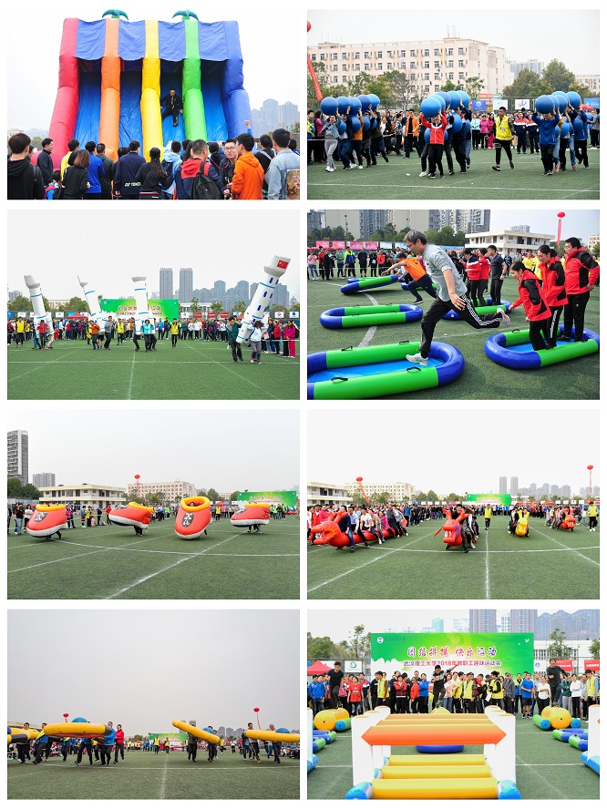 本次教职工趣味体育竞赛以“团结拼搏 快乐运动”为主题,分为集体项目和个人项目。集体项目有:一飞冲天、十拿九稳、急速冲刺、风雨同舟、七星连珠、陆地龙舟、和“鞋”奋进、智勇闯关8项,以分工会为单位组队参加,每项集体项目按单项积分计入趣味项目团体总分。个人项目有趣味投篮、趣味高尔夫、蹦床飞镖、愤怒的小鸟、铅笔套圈、九宫射门6项,自愿报名参加,成绩不计入运动会成绩。比赛当天秋风瑟瑟,寒意阵阵,还一度下起了小雨,却丝毫没有影响教职工们的参赛热情。场上运动员们团结协作、奋勇拼搏,场边观众们的呐喊助威声不绝于耳,掌声、欢笑声此起彼伏。比赛在当天圆满结束。
