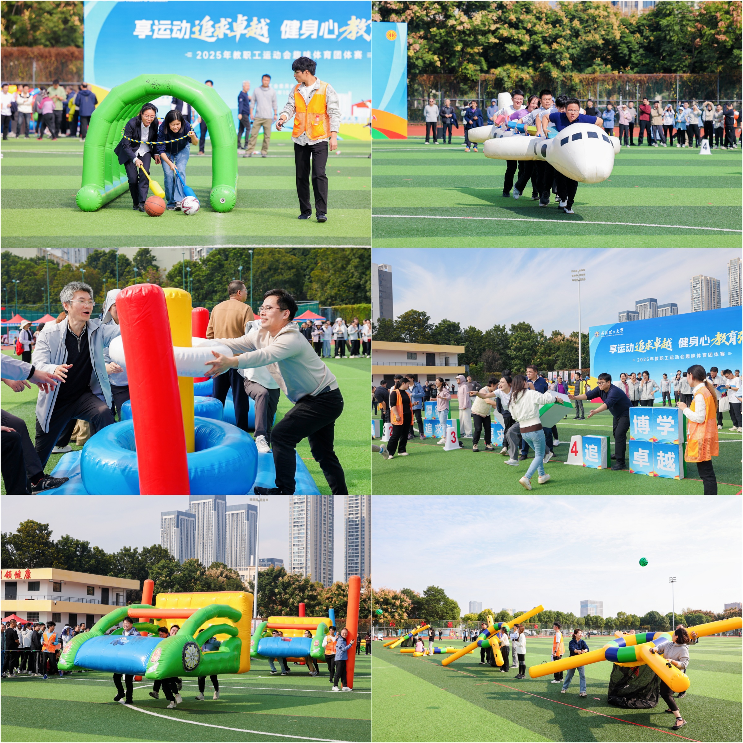 本次教职工运动会趣味体育团体赛,分为集体项目、个人项目和亲子项目。集体项目“合作共赢”“空投补给”“汉诺塔”“理工精神”“奔赴未来”“精准投递”六项,以二级工会为单位组队参加。个人项目和亲子项目则采取现场报名方式,由教职工及家属共同参与。