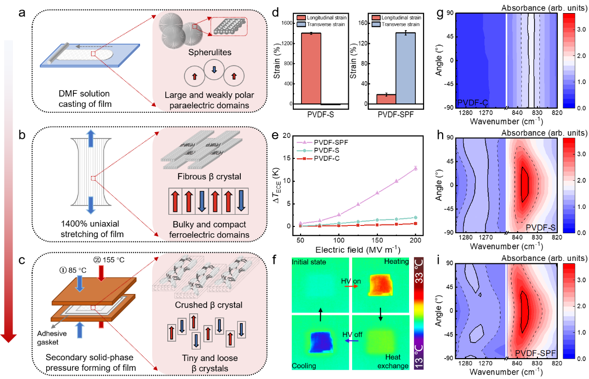 针对上述挑战,熊传溪教授团队提出并发展了一种固相压力成型加工策略,在不引入化学改性的条件下,使最常用、成本最低的铁电聚合物——聚偏氟乙烯(PVDF)实现了显著增强的电卡响应。研究结果表明,经固相压力成型处理后的PVDF薄膜表现出高达12.8 K的巨电卡效应,其有效工作温度窗口宽达60°C。传统认识中,PVDF由于分子结构高度对称、铁电畴尺寸较大且晶体结构致密,其电卡效应通常可以忽略不计。该研究通过纯物理加工方式有效重构了材料内部晶体结构,使致密晶体被破碎并转变为松散、微小的β相晶体结构。研究表明,该巨电卡效应主要来自松散与致密β晶结构差异引发的分子链取向熵变,以及微小晶粒中极性偶极子的翻转熵变。鉴于PVDF原材料的广泛可获得性和成熟加工基础,该研究为构建可扩展、低成本的聚合物固态制冷技术提供了新的研究思路和实现路径。
